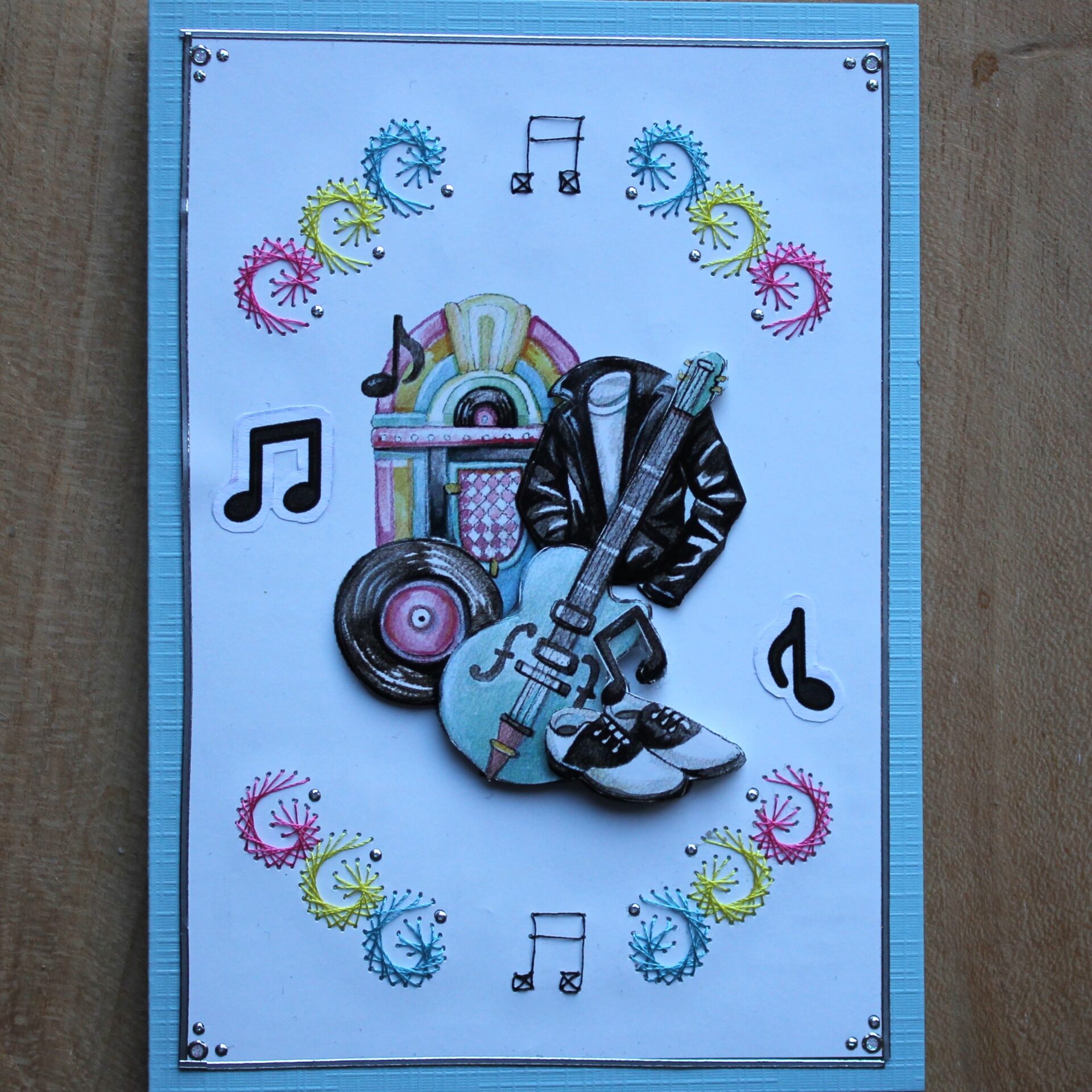 Borduurkaart, 3D-afbeelding muziek, jukebox, gitaar, grammofoonplaat, leren jack en schoenen