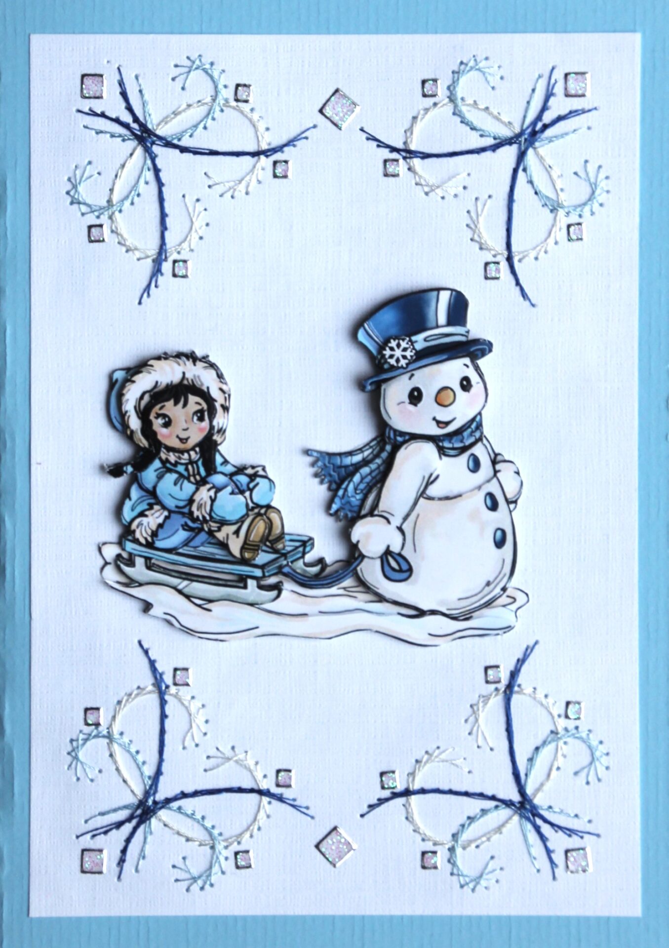 Borduurkaart blauw/wit, 3D-afbeelding sneeuwman met meisje op slee