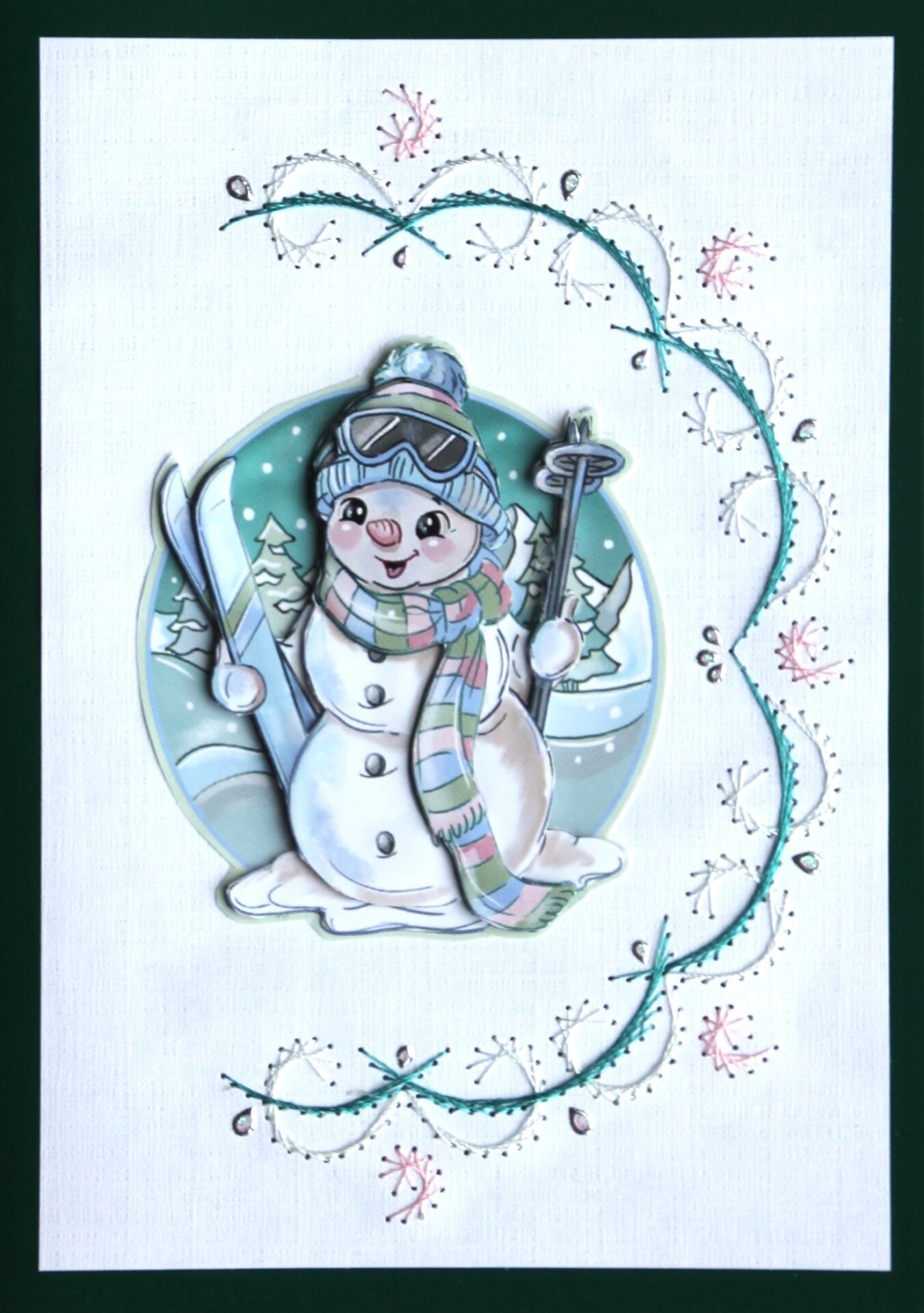 Borduurkaart groen/wit, 3D-afbeelding sneeuwman met muts, sjaal, skibril en ski’s en skistokken
