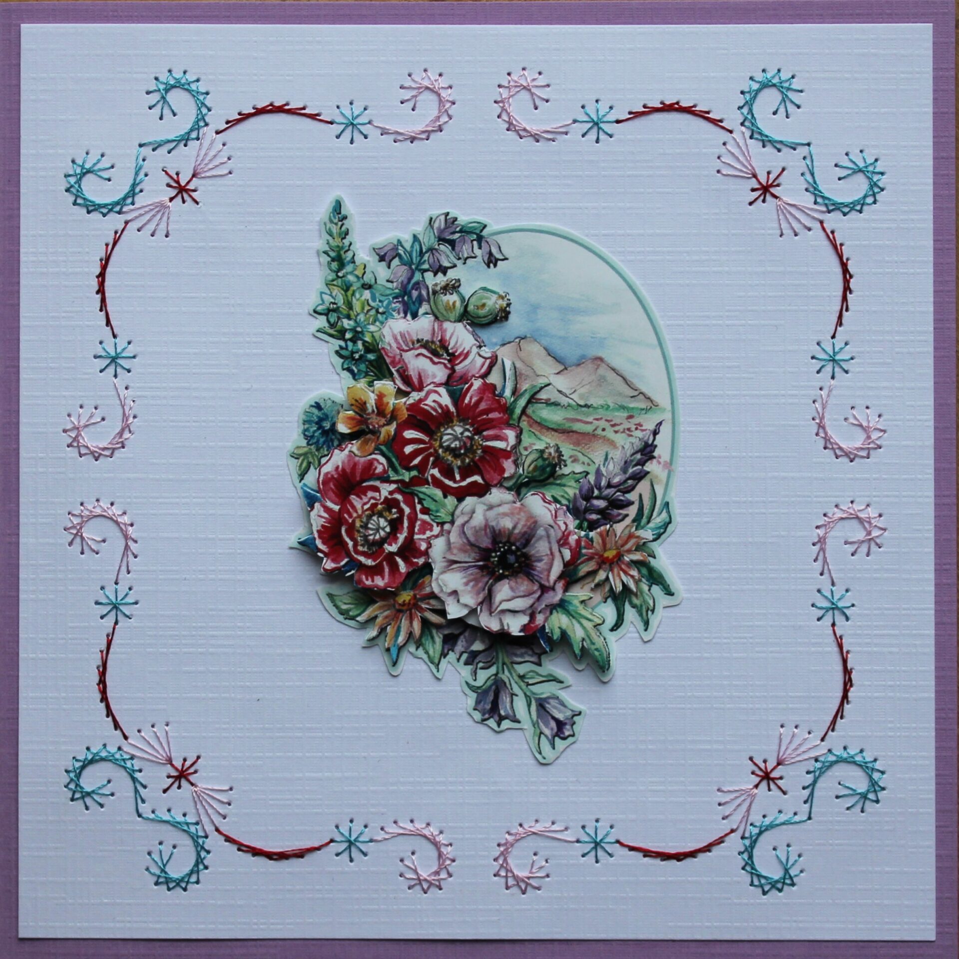 Borduurkaart paars/wit, plaatje voorgrond bloemen met berg op achtergrond
