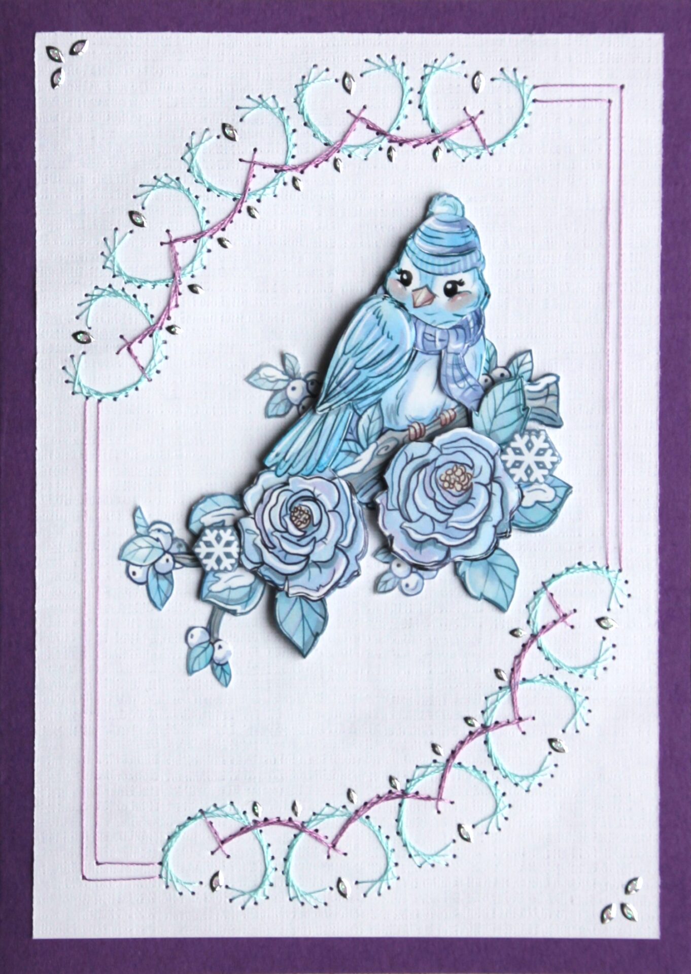 Borduurkaart paars/blauw/wit, 3D-afbeelding vogeltje met wintermuts op tak met winterbloemen