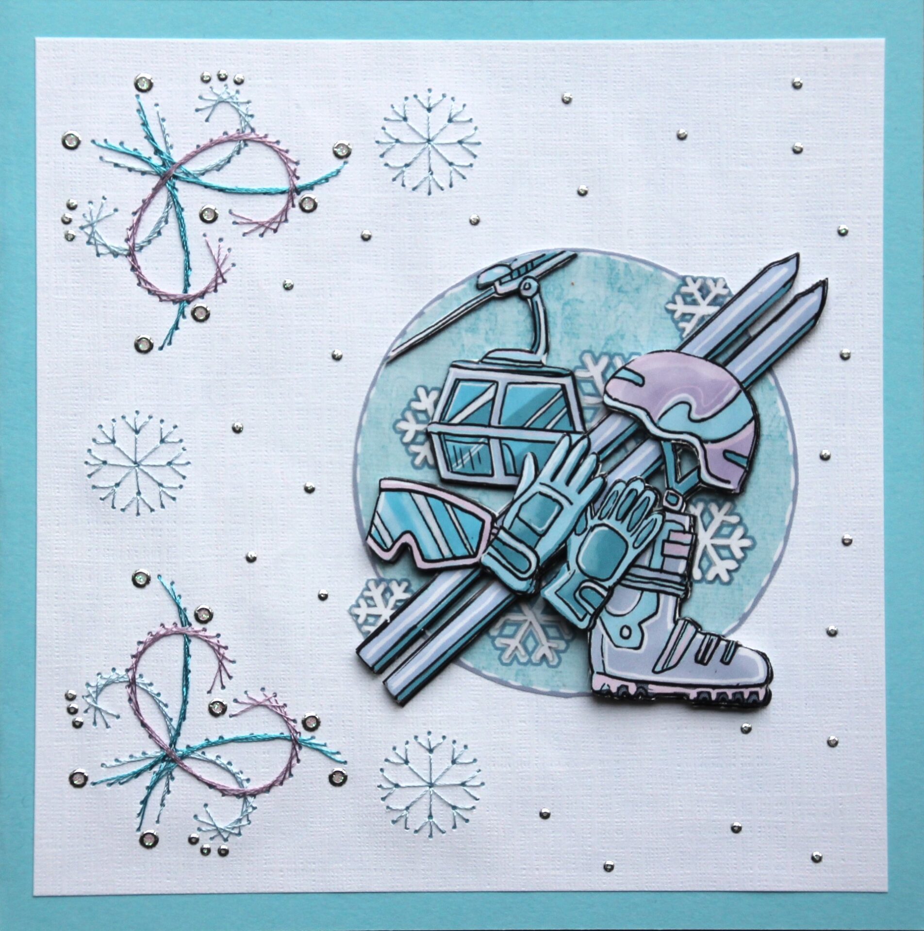 Borduurkaart winter blauw/wit, 3 plaatje skilift, ski’s, skischoen, helm, bril en handschoenen