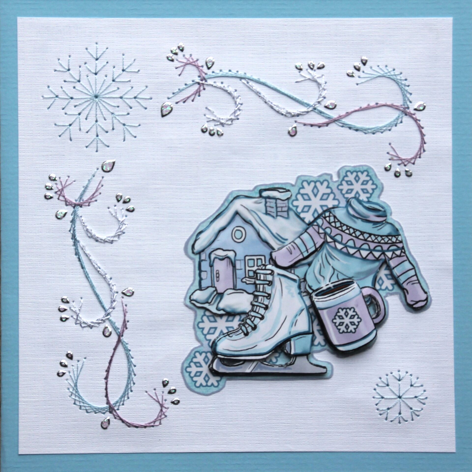 Borduurkaart winter blauw/wit, 3 plaatje winterhuisje, schaatsen, trui en mok warme chocolademelk
