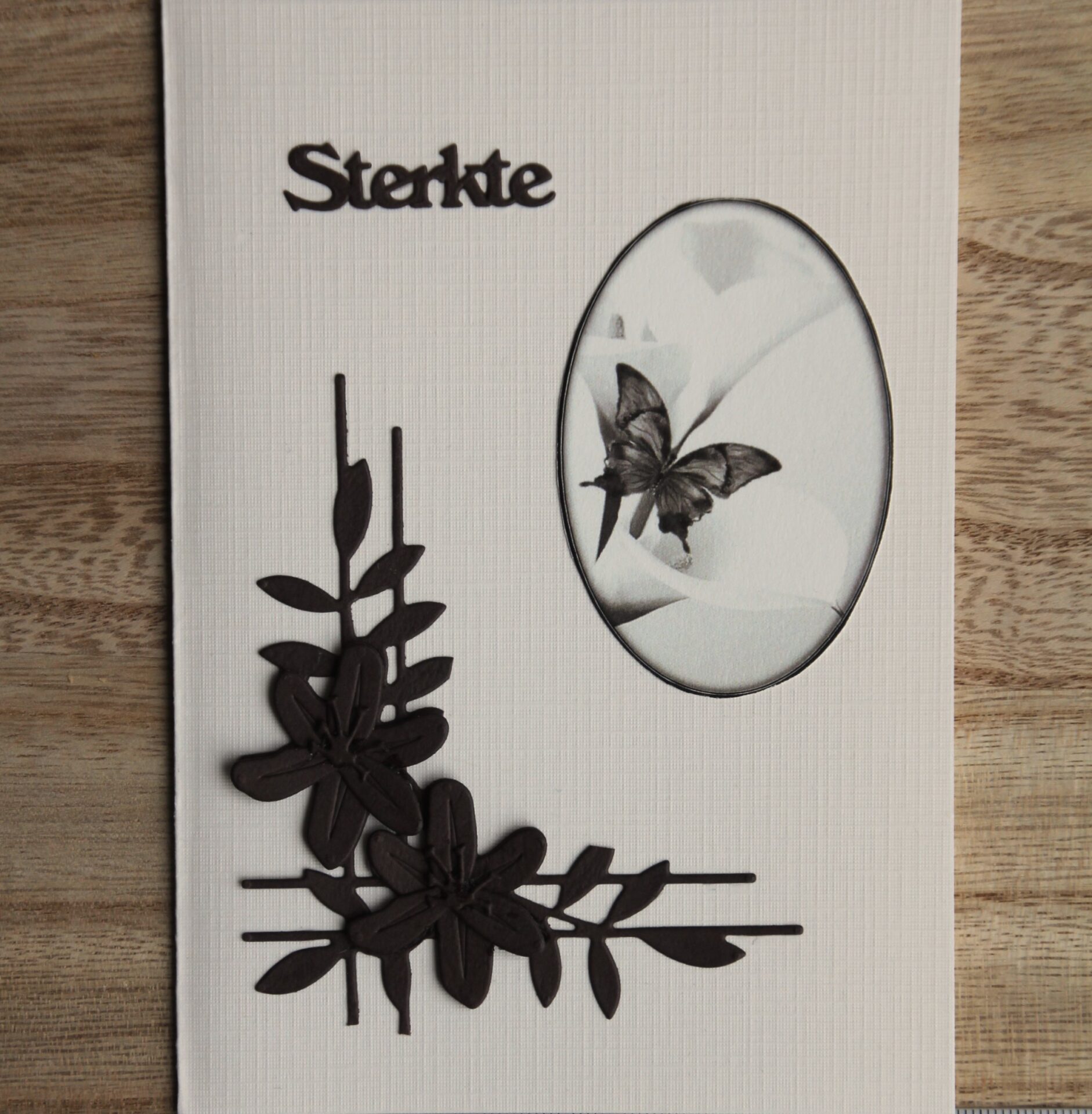 Condoleancekaart creme/bruin, lily corner, ovaal plaatje lelie met vlinder, tekst Sterkte A6
