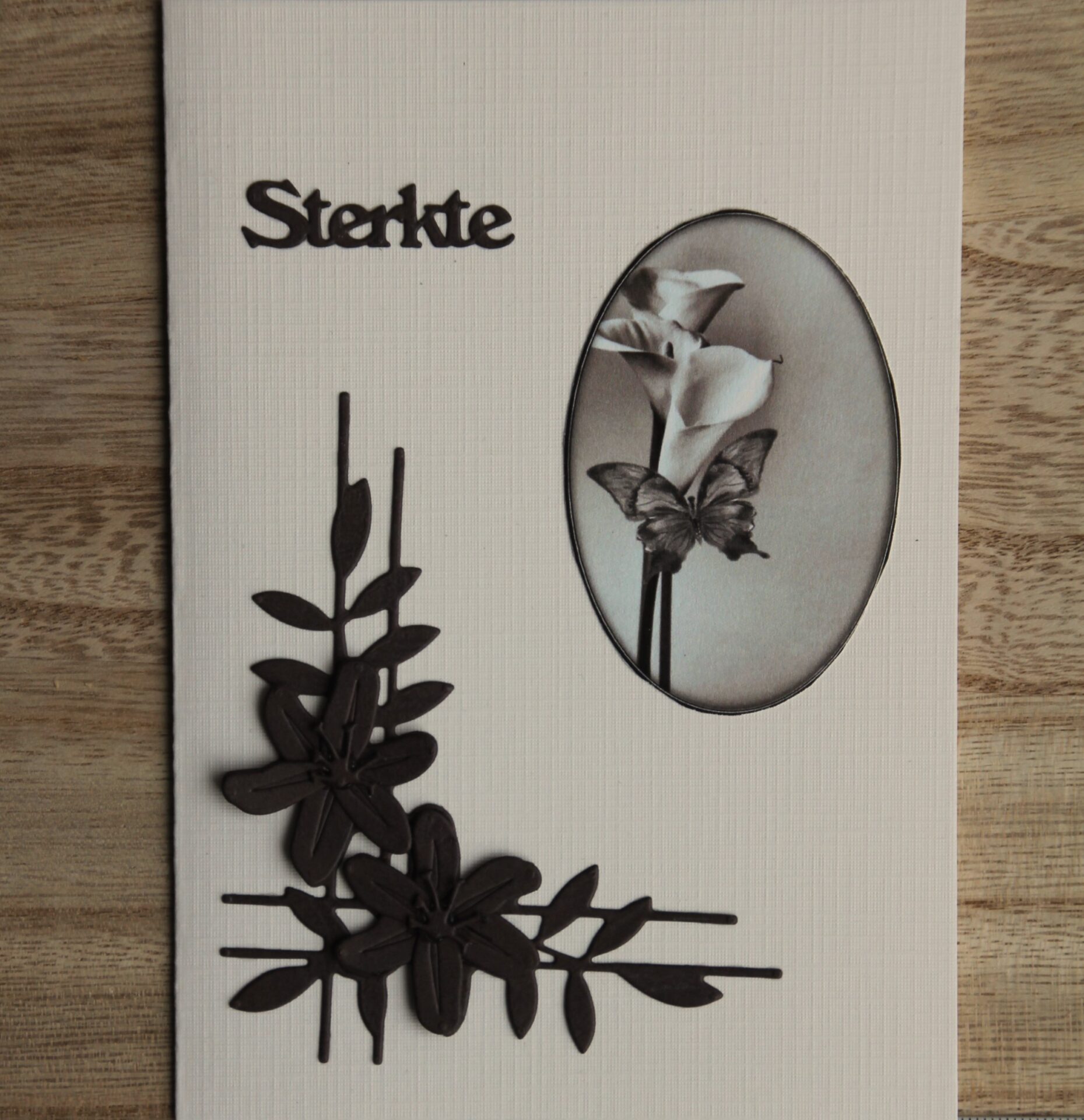 Condoleancekaart creme/bruin, lily corner, ovaal plaatje lelie, tekst Sterkte A6