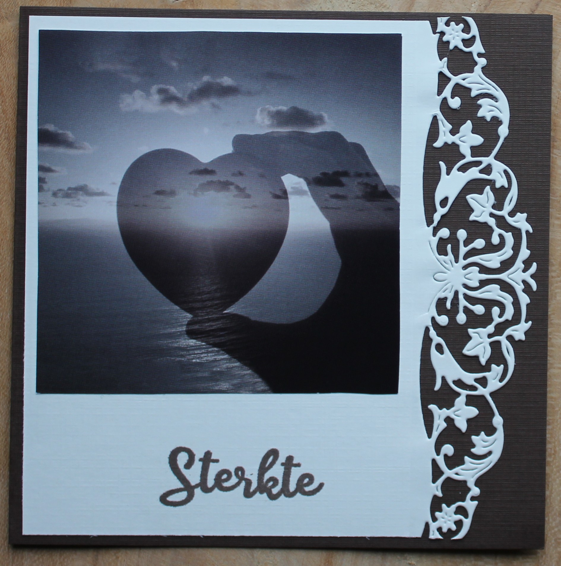 Condoleancekaart donkerbruin/wit, Classic border plaatje hart in hand, tekst Sterkte
