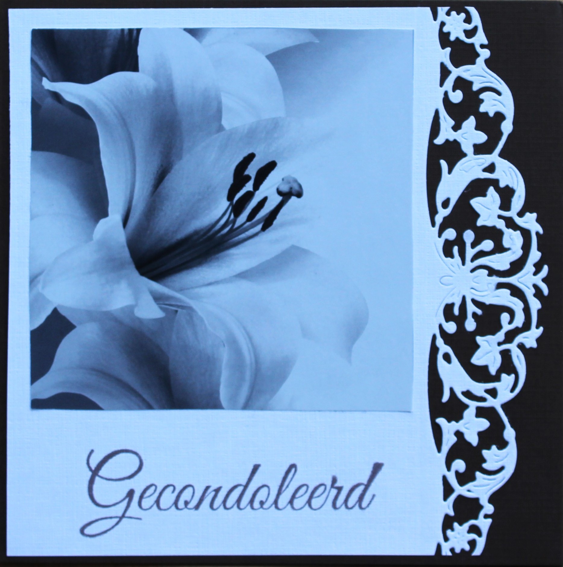 Condoleancekaart donkerbruin/wit, Classic border plaatje leliebloem, tekst Gecondoleerd