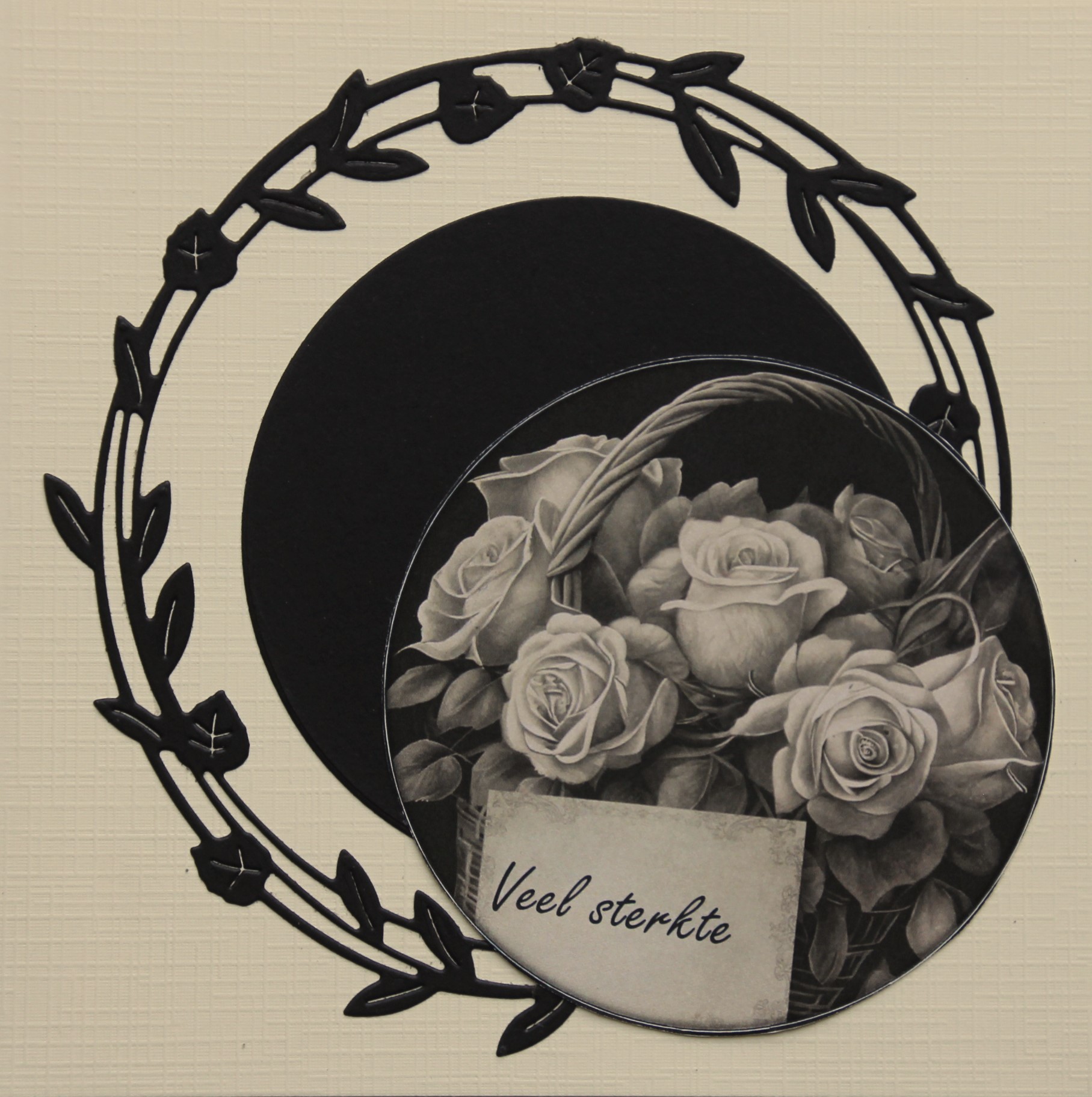 Condoleancekaart creme/bruin, leaf circle, rond plaatje rozen in mand, tekst Veel sterkte
