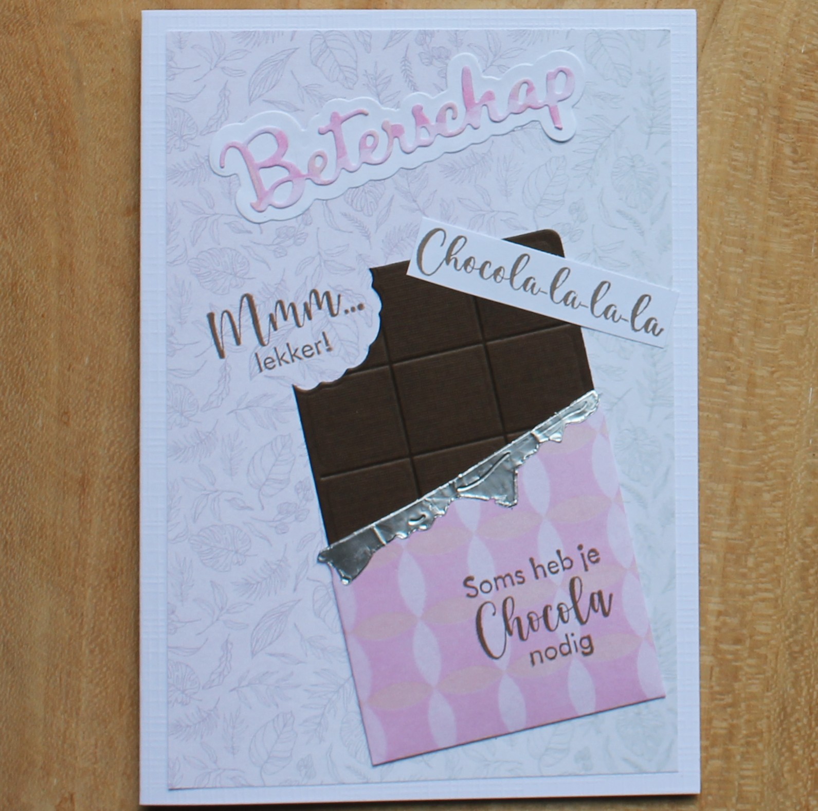 Kaart beterschap, stans, plaatje chocoladereep, tekst Beterschap, Mmm…. lekker! Chocola-la-la-la, Soms heb je chocola nodig