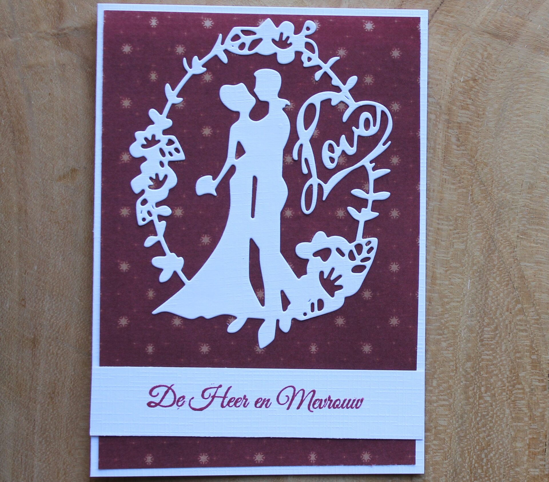 Kaart felicitatie huwelijk wit/d.rood, stans, bruidspaar in ovaal met tekst De Heer en Mevrouw