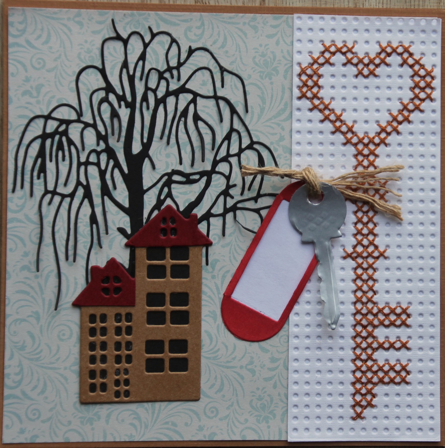 Kaart Verhuizing/nieuwe woning, borduren kruissteek, stans sleutel rood met kale boom