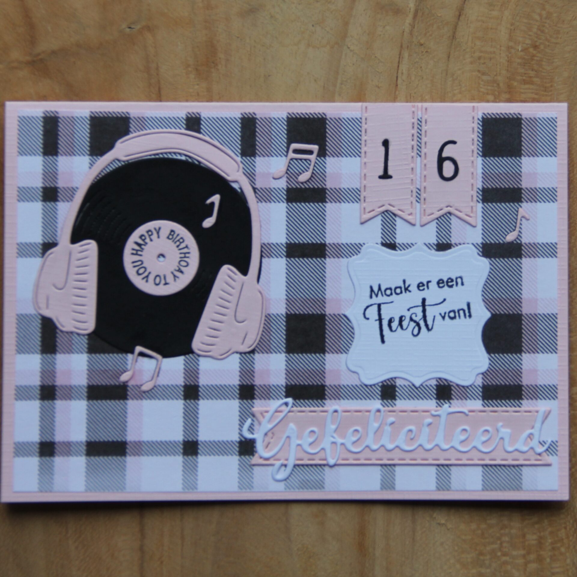 Kaart, verjaardag 16 jaar (sweet sixteen), grammofoonplaat met koptelefoon, tekst 16, gefeliciteerd, maak er een feest van