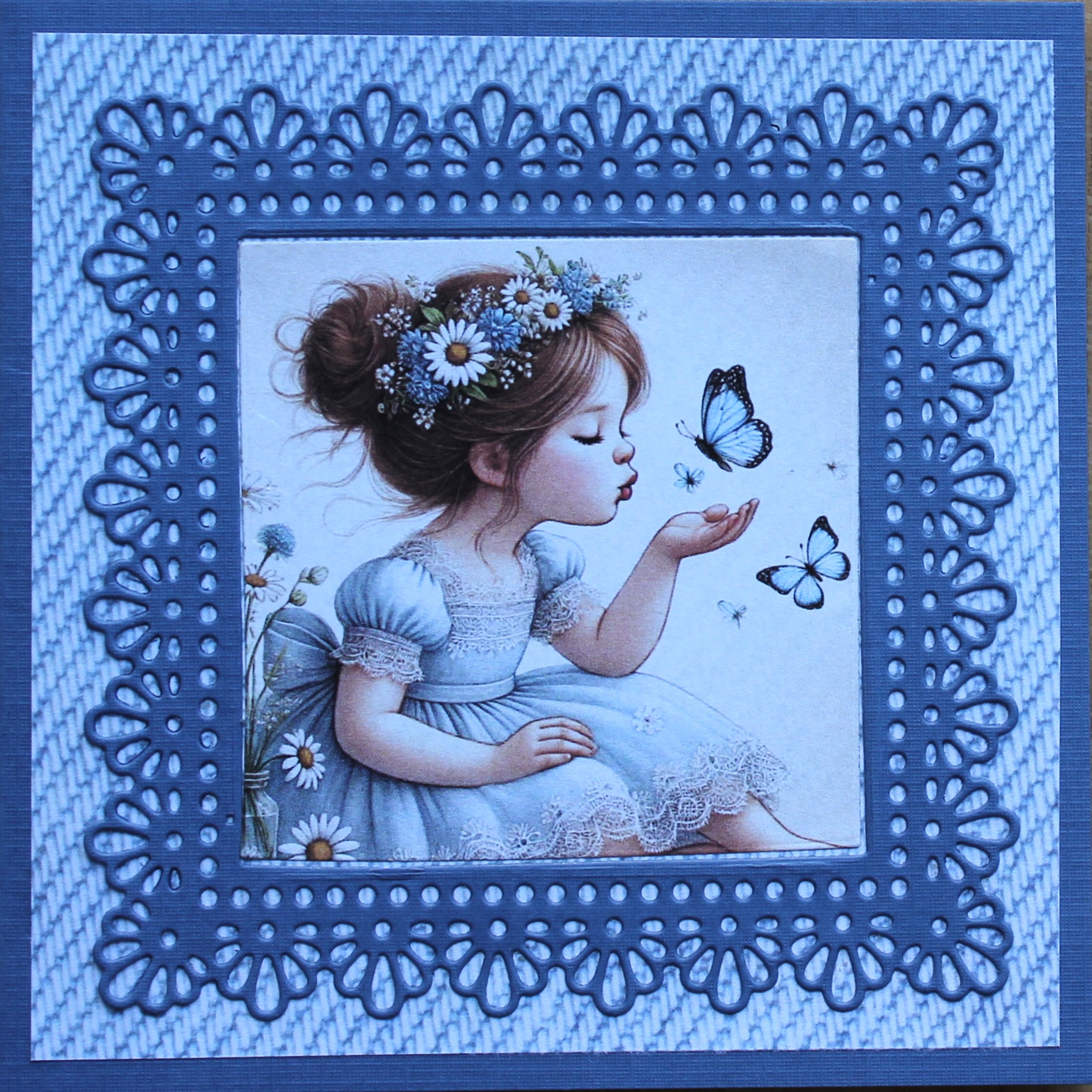 Kinderkaart stans, blauw, meisje met bloemen in haar met vlinders