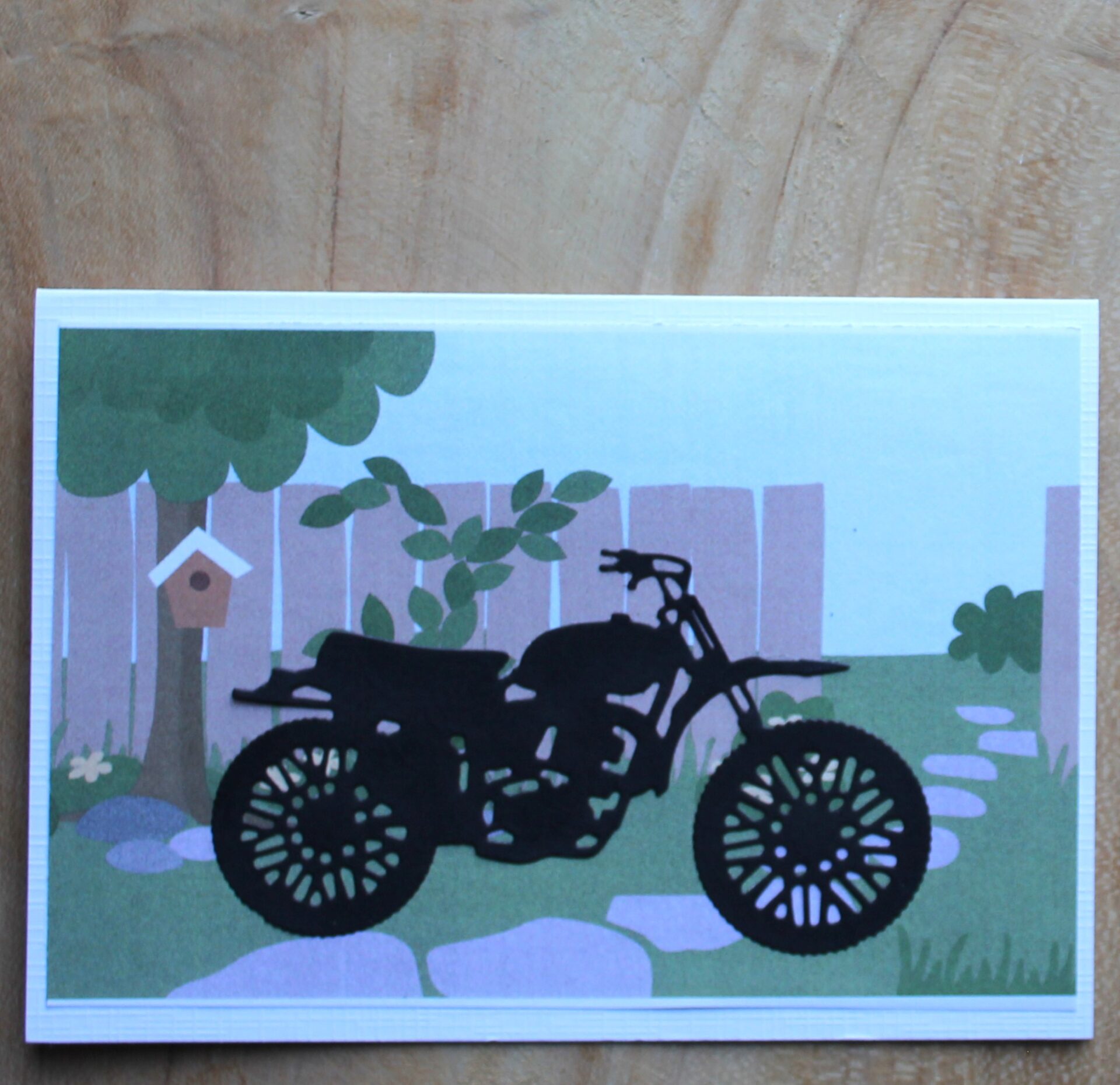 Stanskaart A5 dubbel, achtergrond tuin met schutting, motor op de voorgrond (kan ook met tekst via mailtje naar info@di-ka.nl)