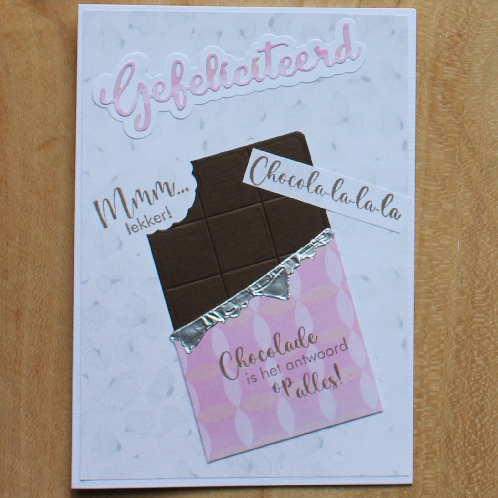 Stanskaart, plaatje chocoladereep, tekst Gefeliciteerd, Mmm…. lekker! Chocola-la-la-la, Chocola is antwoord op alles