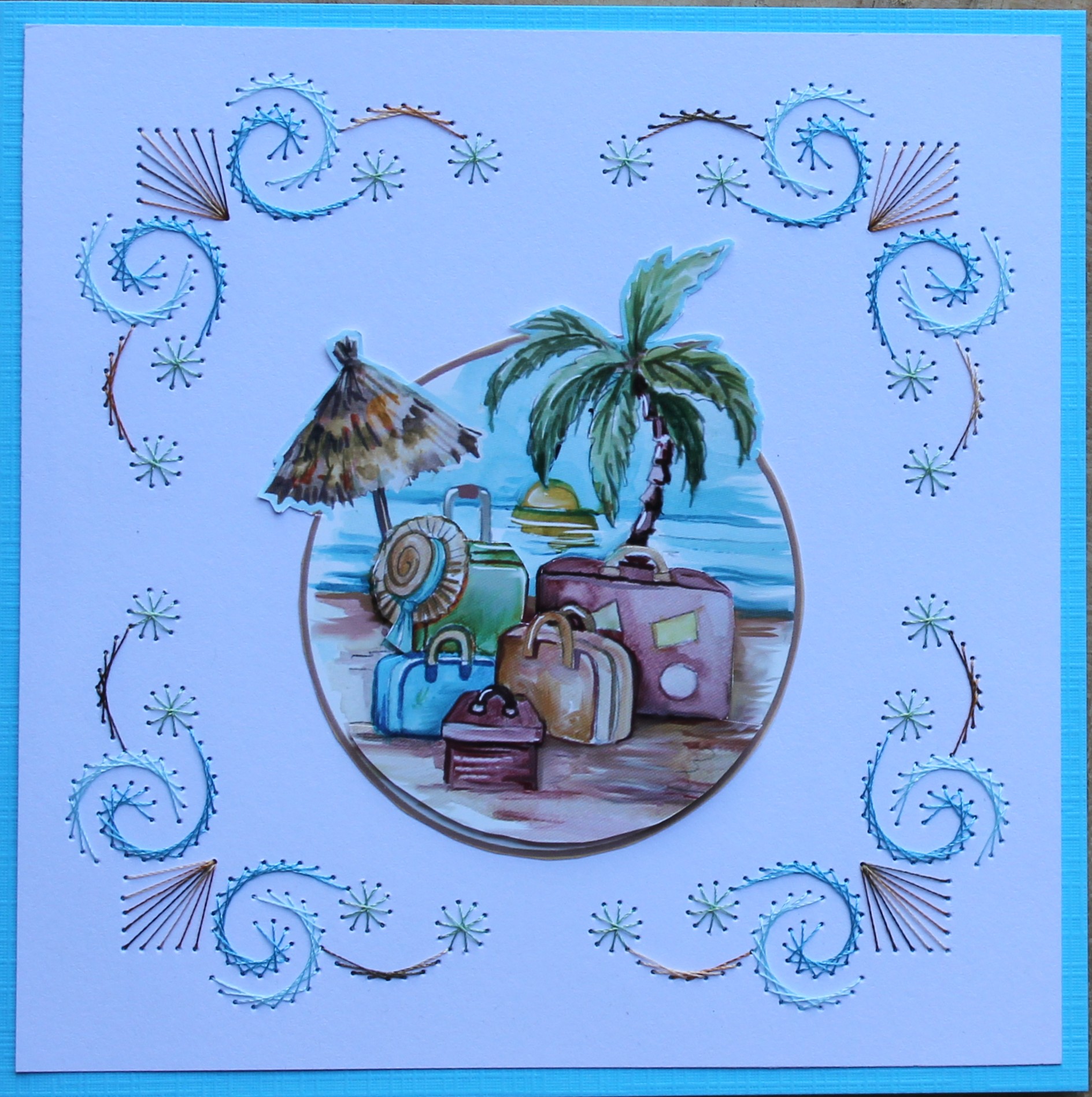 Zomer borduurkaart blauw/wit, plaatje koffers, palm en parasol