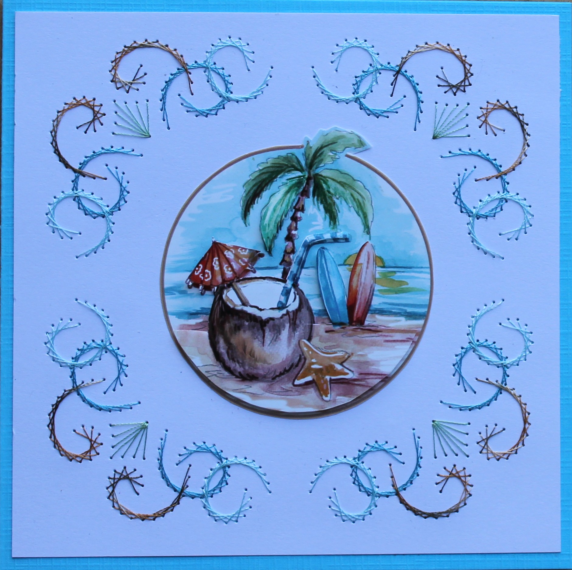Zomer borduurkaart blauw/wit, plaatje palmnootcoctail, palm en surfplanken